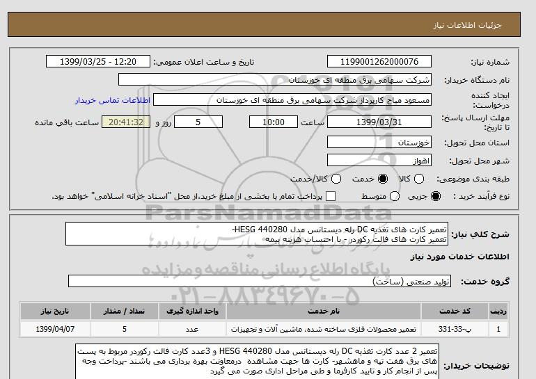 شرح کلی نیاز: تعمیر کارت های تغذیه DC رله دیستانس مدل HESG 440280-