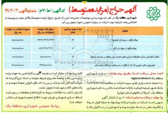 شهرداری منطقه یک تهران در نظر دارد بهره برداری موضوعات مشروحه ذیل را از طریق حراج مزایده متوسط واگذار نماید بدین وسیله از اشخاص واجد شرایط جهت شرکت در مزایده دعوت به عمل می آید.