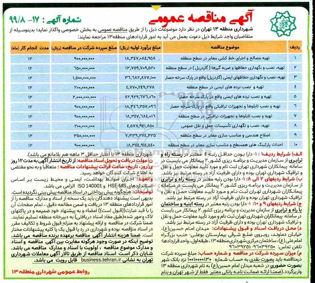 شهرداری منطقه 13 تهران در نظر دارد موضوعات ذیل را از طریق مناقصه عمومی به بخش خصوصی واگذار نماید. بدینوسیله از متقاضیان واجد شرایط ذیل دعوت به عمل می آید به امور قراردادهای منطقه 13 مراجعه نمایند.