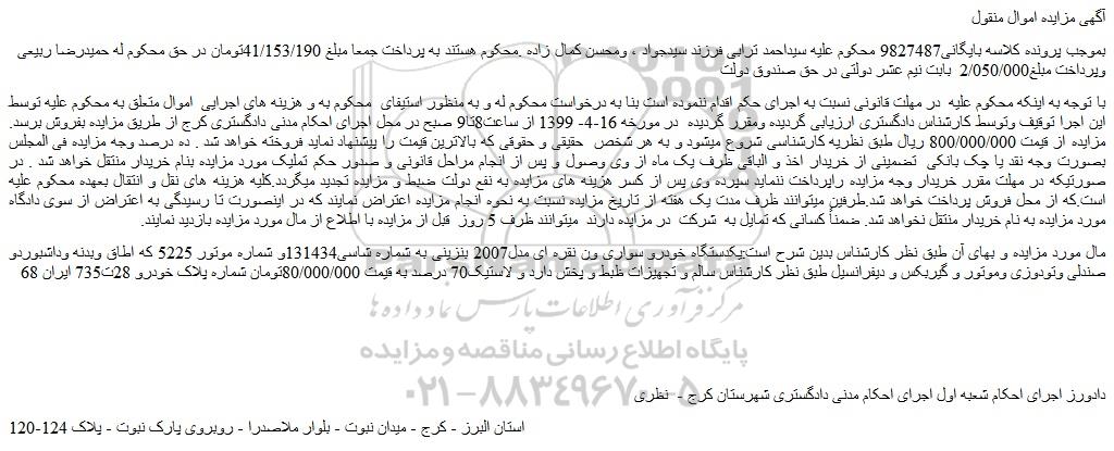 با توجه به اینکه محکوم علیه  در مهلت قانونی نسبت به اجرای حکم اقدام ننموده است بنا به درخواست محکوم له و به منظور استیفای  محکوم به و هزینه های اجرایی  اموال متعلق به محکوم علیه توسط این اجرا توقیف وتوسط کارشناس دادگستری ارزیابی گردیده ومقرر گردیده  در مورخه 16-4- 1399 از ساعت8تا9 صبح در محل اجرای احکام مدنی دادگستری کرج از طریق مزایده بفروش برسد. مزایده از قیمت 800/000/000 ریال طبق نظریه کارشناسی شروع میشود و به هر شخص  حقیقی و حقوقی که بالاترین قیمت را پیشنهاد نماید فروخته خواهد شد . ده درصد وجه مزایده فی المجلس بصورت وجه نقد یا چک بانکی  تضمینی از خریدار اخذ و الباقی ظرف یک ماه از وی وصول و پس از انجام مراحل قانونی و صدور حکم تملیک مورد مزایده بنام خریدار منتقل خواهد شد . در صورتیکه در مهلت مقرر خریدار وجه مزایده راپرداخت ننماید سپرده وی پس از کسر هزینه های مزایده به نفع دولت ضبط و مزایده تجدید میگردد.کلیه هزینه های نقل و انتقال بعهده محکوم علیه است.که از محل فروش پرداخت خواهد شد.طرفین میتوانند ظرف مدت یک هفته از تاریخ مزایده نسبت به نحوه انجام مزایده اعتراض نمایند که در اینصورت تا رسیدگی به اعتراض از سوی دادگاه مورد مزایده به نام خریدار منتقل نخواهد شد. ضمناً کسانی که تمایل به  شرکت  در مزایده دارند  میتوانند ظرف 5 روز  قبل از مزایده با اطلاع از مال مورد مزایده بازدید نمایند.