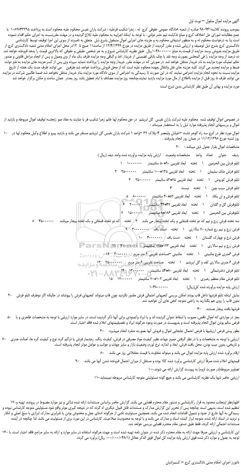 بموجب پرونده کلاسه980941 صادره از شعبه 8دادگاه عمومی حقوقی کرج له : زهرا شکیب فرعلیه : شرکت یاران نفیس محکوم علیه محکوم است به پرداخت 1082843295 با جمع مطالبات شورای حل اختلاف کرج و مبلغ 5%بابت نیم عشر دولتی . با توجه به اینکه اجراییه به محکوم علیه ابلاغ گردیده و در مهلت مقررنسبت به اجرای حکم اقدام ننموده است بنا به درخواست محکوم له و به منظور استیفای محکوم به و هزینه های اجرایی اموال منمقول بشرح ذیل متعلق به نامبرده از سوی این اجرا توقیف توسط کارشناسی دادگستری کرج بشرح ذیل توصیف و ارزیابی شده و مقرر گردیده از طریق مزایده در مورخ 12/4/1399 از ساعت11 صبح تا 12در محل اجرای احکام مدنی شعبه دادگستری کرج از طریق مزایده بفروش برسد. مزایده از قیمت به مبلغ 1048000000ریال طبق نظریه کارشناس شروع و به هر شخص حقیقی و حقوقی که بالاترین قیمت را بدهد فروخته خواهد شد. ده درصد از وجه مزایده را فی المجلس بصورت وجه نقد یا چک بانکی تضمینی از خریدار اخذ و الباقی وجه مزایده ظرف یک ماه از وی وصول و پس از انجام مراحل قانونی و صدور حکم تملیک مورد مزایده به نام خریدار منتقل خواهد شد. در صورتی که در مهلت مقرر خریدار وجه مزایده را پرداخت ننماید سپرده وی پس از کسر هزینه های مزایده به نفع دولت ضبط و مزایده تجدید می گردد. کلیه هزینه های نقل وانتقال بعهده محکوم علیه است که از محل فروش پرداخت خواهد شد طرفین می توانند ظرف مدت یک هفته از تاریخ مزایده نسبت به نحوه انجام مزایده اعتراض نمایند که در این صورت تا رسیدگی به اعتراض از سوی دادگاه مورد مزایده بنام خریدار منتقل نخواهد شد ضمنا طالبین شرکت در مزایده می توانند ظرف 5 روز قبل از مزایده بااطلاع از مال مورد مزایده بازدید نمایند.چنانجه روز مزایده مصادف با ایام تعطیل باشد روز بعددر همان ساعت و مکان برگزار خواهد شد