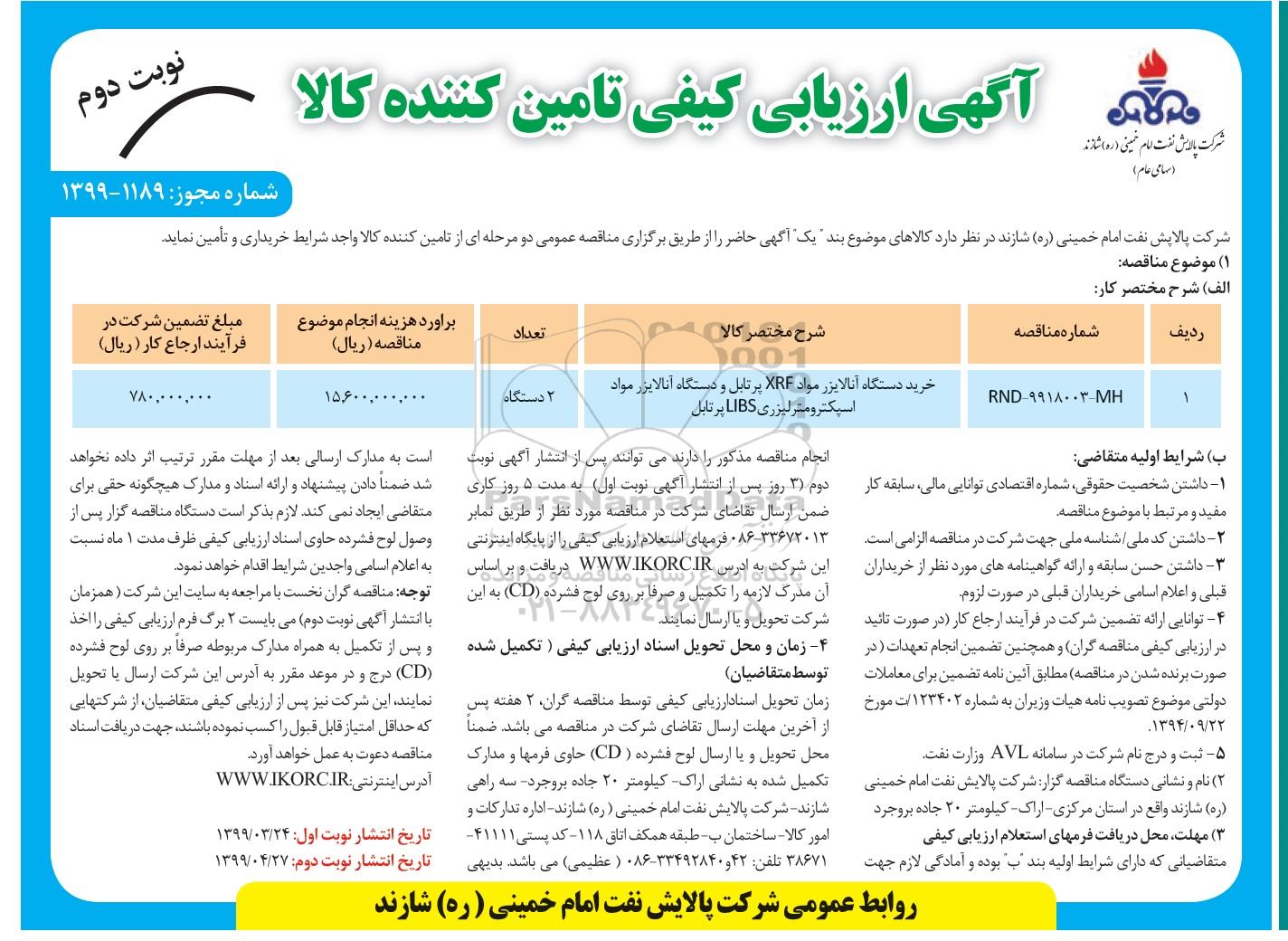 شرکت پالایش نفت امام خمینی (ره) شازند در نظر دارد کالاهای موضوع بند یک آگهی حاضر را از طریق برگزاری مناقصه عمومی دو مرحله ای از تامین کننده واجد شرایط خریداری و تامین نماید.