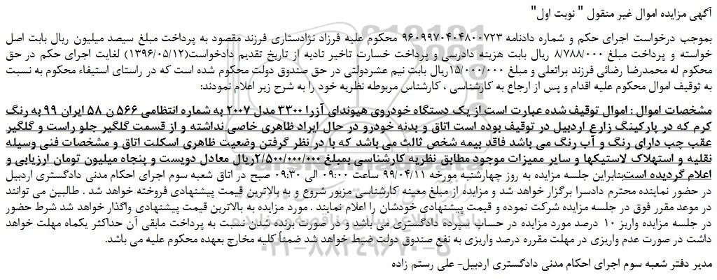 مشخصات اموال : اموال توقیف شده عبارت است از یک دستگاه خودروی هیوندای آزرا 3300 مدل 2007 به شماره انتظامی 566 ن 58 ایران 99 به رنگ کرم که در پارکینگ زارع اردبیل در توقیف بوده است اتاق و بدنه خودرو در حال ایراد ظاهری خاصی نداشته و از قسمت گلگیر جلو راست و گلگیر عقب چب دارای رنگ و آب رنگ می باشد فاقد بیمه شخص ثالث می باشد که با در نظر گرفتن وضعیت ظاهری اسکلت اتاق و مشخصات فنی وسیله نقلیه و استهلاک لاستیکها و سایر ممیزات موجود مطابق نظریه کارشناسی بمبلغ 2/500/000/000ریال معادل دویست و پنجاه میلیون تومان ارزیابی و اعلام گردیده استبنابراین جلسه مزایده به روز چهارشنبه مورخه 99/04/11 ساعت 09:00 الی 09:30 صبح در اتاق شعبه سوم اجرای احکام مدنی دادگستری اردبیل در حضور نماینده محترم دادسرا برگزار خواهد شد و مزایده از مبلغ معینه کارشناسی مزبور شروع و به بالاترین قیمت پیشنهادی فروخته خواهد شد . طالبین می توانند در موعد مقرر فوق در جلسه مزایده شرکت نموده و قیمت پیشنهادی خودشان را اعلام نمایند . مورد مزایده به بالاترین قیمت پیشنهادی واگذار خواهد شد شرط حضور در جلسه مزایده واریز 10 درصد مورد مزایده در حساب سپرده دادگستری می باشد و در صورت برنده شدن نسبت به پرداخت مابقی آن حداکثر یکماه مهلت خواهد داشت در صورت عدم واریزی در مهلت مقرره درصد واریزی به نفع صندوق دولت ضبط خواهد شد ضمناً کلیه مخارج بعهده محکوم علیه می باشد.