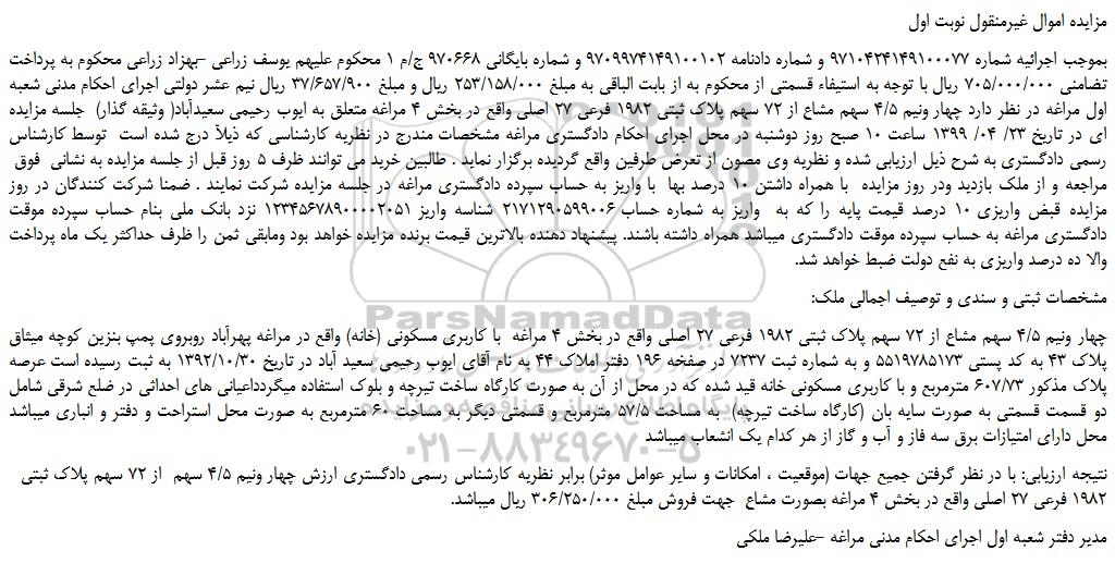 بموجب اجرائیه شماره 9710424149100077 و شماره دادنامه 9709974149100102 و شماره بایگانی 970668 ج/م 1 محکوم علیهم یوسف زراعی -بهزاد زراعی محکوم به پرداخت تضامنی 705/000/000 ریال با توجه به استیفاء قسمتی از محکوم به از بابت الباقی به مبلغ 253/158/000 ریال و مبلغ 37/657/900 ریال نیم عشر دولتی اجرای احکام مدنی شعبه اول مراغه در نظر دارد چهار ونیم 4/5 سهم مشاع از 72 سهم پلاک ثبتی 1982 فرعی 27 اصلی واقع در بخش 4 مراغه متعلق به ایوب رحیمی سعیدآباد( وثیقه گذار) جلسه مزایده ای در تاریخ 23/ 04/ 1399 ساعت 10 صبح روز دوشنبه در محل اجرای احکام دادگستری مراغه مشخصات مندرج در نظریه کارشناسی که ذیلآ درج شده است توسط کارشناس رسمی دادگستری به شرح ذیل ارزیابی شده و نظریه وی مصون از تعرض طرفین واقع گردیده برگزار نماید . طالبین خرید می توانند ظرف 5 روز قبل از جلسه مزایده به نشانی فوق مراجعه و از ملک بازدید ودر روز مزایده با همراه داشتن 10 درصد بها با واریز به حساب سپرده دادگستری مراغه در جلسه مزایده شرکت نمایند . ضمنا شرکت کنندگان در روز مزایده قبض واریزی 10 درصد قیمت پایه را که به واریز به شماره حساب 2171290599006 شناسه واریز 12345678900002051 نزد بانک ملی بنام حساب سپرده موقت دادگستری مراغه به حساب سپرده موقت دادگستری میباشد همراه داشته باشند. پیشنهاد دهنده بالاترین قیمت برنده مزایده خواهد بود ومابقی ثمن را ظرف حداکثر یک ماه پرداخت والا ده درصد واریزی به نفع دولت ضبط خواهد شد.