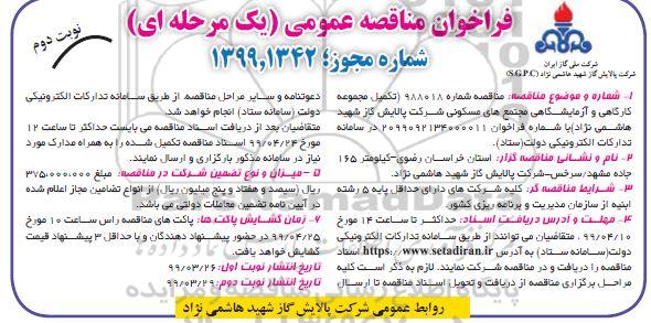 1- شماره و موضوع مناقصه: مناقصه شماره988018 (تکمیل مجموعه کارگاهی و آزمایشگاهی مجتمع های مسکونی شرکت پالایش گاز شهید هاشمی نژاد شماره فراخوان 2099092134000011 در سامانه تدارکات الکترونیکی دولت (ستاد)