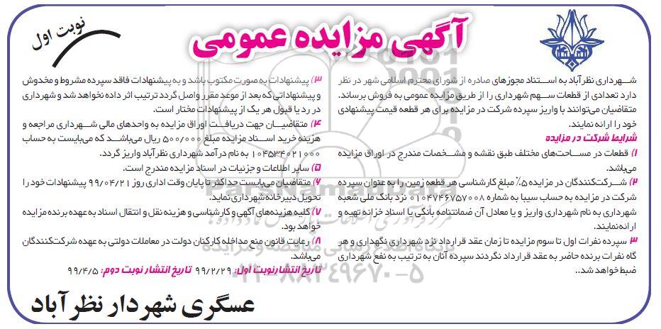 شهرداری نظرآباد به استناد مجوزهای صادره از شورای محترم اسلامی شهر در نظر دارد تعدادی از قطعات سهم شهرداری را از طریق مزایده عمومی به فروش برساند