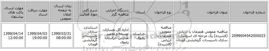 | 2099004542000023 | مناقصه عمومی همزمان با ارزیابی (فشرده) یک مرحله ای استاندارد سازی تاسیسات گرمایشی قوچان | مناقصه عمومی همزمان با ارزیابی (فشرده) | خراسان رضوی | اداره کل نوسازی، توسعه و تجهیز مدارس خراسان رضوی | استاندارد سازی تاسیسات گرمایشی قوچان | 1399/03/31 08:00:00 | 1399/04/03 19:00:00 | 1399/04/14 12:00:00 |