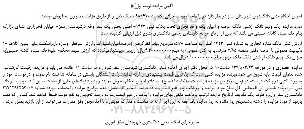 اجرای احکام مدنی دادگستری شهرستان سقز در نظر دارد در رابطه با پرونده اجرائی بکلاسه 981610 ، ملک ذیل را از طریق مزایده حضوری به فروش برساند.