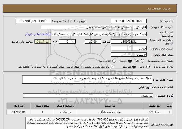 شرح کلی نیاز: اجرای عملیات بهسازی طرح هادی روستاهای دیده بان، پهرست شهرستان لارستان