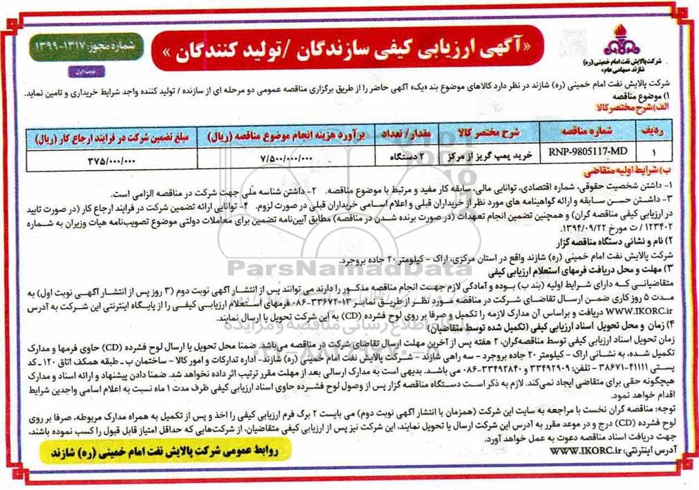 ارزیابی کیفی خرید پمپ گریز از مرکز, آگهی ارزیابی کیفی ,ارزیابی کیفی خرید پمپ گریز از مرکز