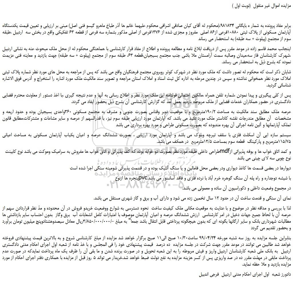 برابر مفاد پرونده به شمار ه بایگانی 981834،(محکوم له آقای کیان صادقی اشرافی محکوم علیهما خانم ها آذر طباخ ماهرو گیسو فنی اصل) مبنی بر ارزیابی و تعیین قیمت یکدستگاه آپارتمان مسکونی از پلاک ثبتی 10880فرعی از86 اصلی مفروز و مجزی شده از 1376فرعی از اصلی مذکور بشماره سه فرعی از قطعه 63 تفکیکی واقع در بخش سه اردبیل ،طبقه سوم از مجتمع (پیلوت + سه طبقه) به استحضار می رساند