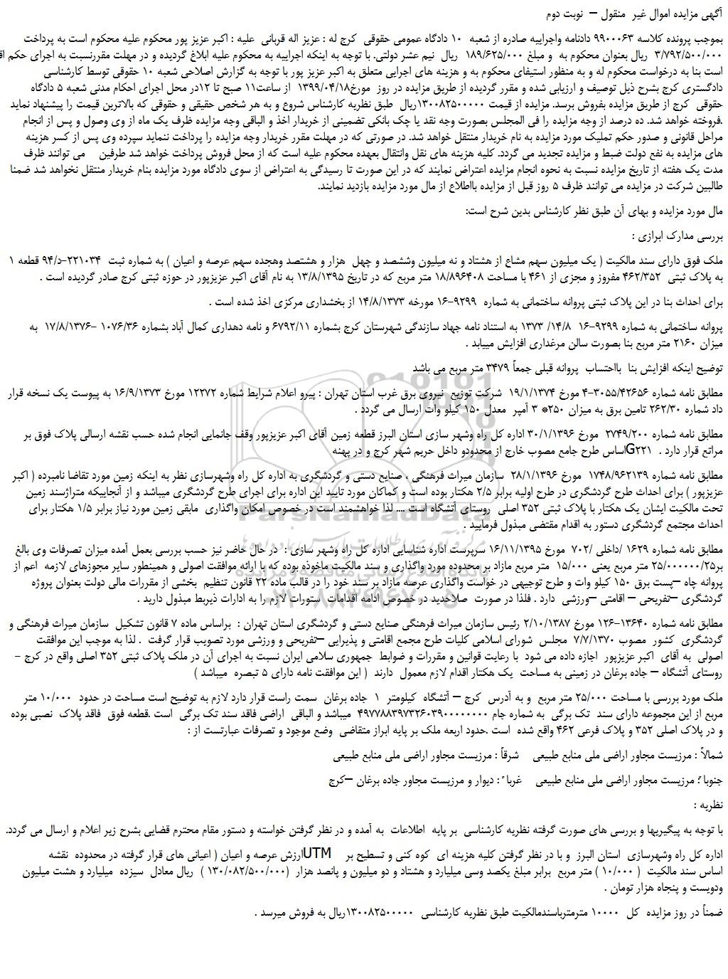 بموجب پرونده کلاسه 9900063 دادنامه واجراییه صادره از شعبه  10 دادگاه عمومی حقوقی  کرج له : عزیز اله قربانی  علیه : اکبر عزیز پور محکوم علیه محکوم است به پرداخت  3/792/500/000  ریال بعنوان محکوم به  و مبلغ 189/625/000  ریال  نیم عشر دولتی. با توجه به اینکه اجراییه به محکوم علیه ابلاغ گردیده و در مهلت مقررنسبت به اجرای حکم اقدام ننموده است بنا به درخواست محکوم له و به منظور استیفای محکوم به و هزینه های اجرایی متعلق به اکبر عزیز پور با توجه به گزارش اصلاحی شعبه 10 حقوقی توسط کارشناسی دادگستری کرج بشرح ذیل توصیف و ارزیابی شده و مقرر گردیده از طریق مزایده در روز  مورخ1399/04/18  از ساعت11 صبح تا 12در محل اجرای احکام مدنی شعبه 5 دادگاه حقوقی  کرج از طریق مزایده بفروش برسد. مزایده از قیمت 130082500000ریال  طبق نظریه کارشناس شروع و به هر شخص حقیقی و حقوقی که بالاترین قیمت را پیشنهاد نماید .فروخته خواهد شد. ده درصد از وجه مزایده را فی المجلس بصورت وجه نقد یا چک بانکی تضمینی از خریدار اخذ و الباقی وجه مزایده ظرف یک ماه از وی وصول و پس از انجام مراحل قانونی و صدور حکم تملیک مورد مزایده به نام خریدار منتقل خواهد شد. در صورتی که در مهلت مقرر خریدار وجه مزایده را پرداخت ننماید سپرده وی پس از کسر هزینه های مزایده به نفع دولت ضبط و مزایده تجدید می گردد. کلیه هزینه های نقل وانتقال بعهده محکوم علیه است که از محل فروش پرداخت خواهد شد طرفین    می توانند ظرف مدت یک هفته از تاریخ مزایده نسبت به نحوه انجام مزایده اعتراض نمایند که در این صورت تا رسیدگی به اعتراض از سوی دادگاه مورد مزایده بنام خریدار منتقل نخواهد شد ضمنا طالبین شرکت در مزایده می توانند ظرف 5 روز قبل از مزایده بااطلاع از مال مورد مزایده بازدید نمایند.
