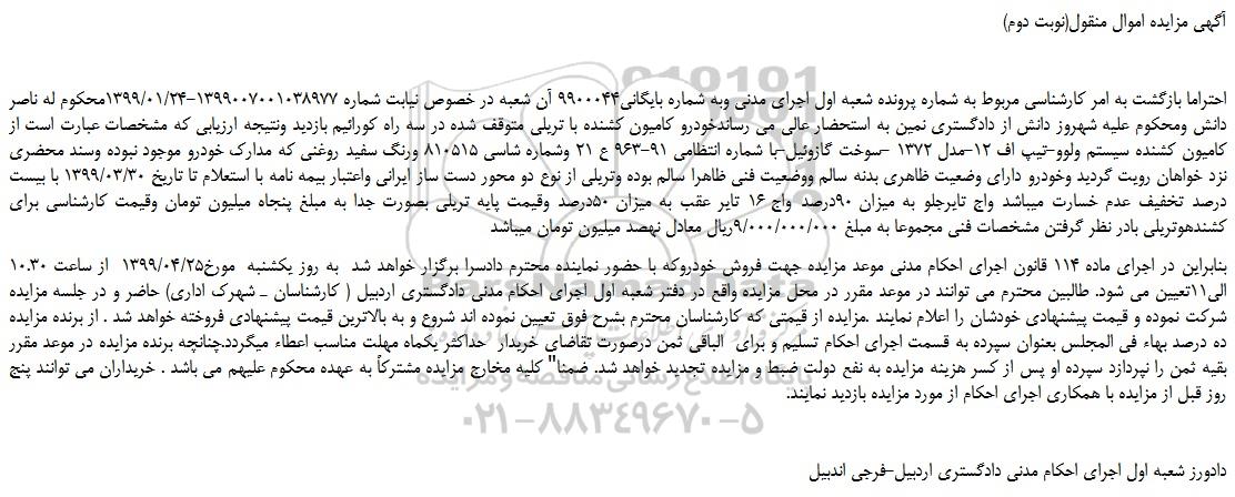 بنابراین در اجرای ماده 114 قانون اجرای احکام مدنی موعد مزایده جهت فروش خودروکه با حضور نماینده محترم دادسرا برگزار خواهد شد به روز یکشنبه مورخ1399/04/25 از ساعت 10.30 الی11تعیین می شود. طالبین محترم می توانند در موعد مقرر در محل مزایده واقع در دفتر شعبه اول اجرای احکام مدنی دادگستری اردبیل ( کارشناسان ـ شهرک اداری) حاضر و در جلسه مزایده شرکت نموده و قیمت پیشنهادی خودشان را اعلام نمایند .مزایده از قیمتی که کارشناسان محترم بشرح فوق تعیین نموده اند شروع و به بالاترین قیمت پیشنهادی فروخته خواهد شد . از برنده مزایده ده درصد بهاء فی المجلس بعنوان سپرده به قسمت اجرای احکام تسلیم و برای الباقی ثمن درصورت تقاضای خریدار حداکثر یکماه مهلت مناسب اعطاء میگردد.چنانچه برنده مزایده در موعد مقرر بقیه ثمن را نپردازد سپرده او پس از کسر هزینه مزایده به نفع دولت ضبط و مزایده تجدید خواهد شد. ضمنا" کلیه مخارج مزایده مشترکاً به عهده محکوم علیهم می باشد . خریداران می توانند پنج روز قبل از مزایده با همکاری اجرای احکام از مورد مزایده بازدید نمایند.