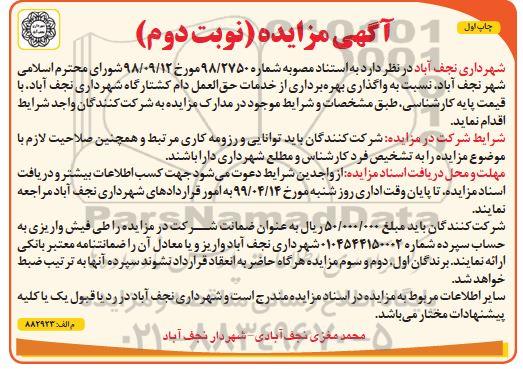 شهرداری نجف آباد در نظر دارد نسبت به واگذاری بهره برداری از خدمات حق العمل دام کشتارگاه شهرداری نجف آباد، با قیمت پایه کارشناسی ، طبق مشخصات و شرایط موجود در مدارک مزایده به شرکت کنندگان واجد شرایط اقدام نماید.