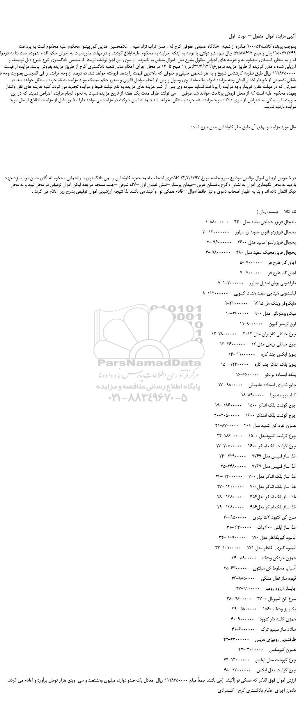 در خصوص ارزیابی اموال توقیفی موضوع صورتجلسه مورخ 22/3/1397 کلانتری اینجانب احمد حمزه کارشناس رسمی دادگستری با راهنمایی محکوم له آقای حسن تراب نژاد جهت بازدید به محل نگهداری اموال به نشانی : گرج باغستان غربی –میدان پرستار –نبش خیابان اول –لاله شرقی –جنب مسجد مراجعه لیکن اموال توقیفی در محل نبود و به محل دیگر انتقال داده اند و بنا به اظهار اصحاب دعوی و نیز حافظ اموال –اقلام همگی نو وآکبند می باشند لذا نتیجه ارزشیابی اموال توقیفی بشرح زیر اعلام می گردد .
