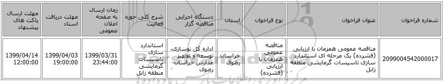 | 2099004542000017 | مناقصه عمومی همزمان با ارزیابی (فشرده) یک مرحله ای استاندارد سازی تاسیسات گرمایشی منطقه زابل | مناقصه عمومی همزمان با ارزیابی (فشرده) | خراسان رضوی | اداره کل نوسازی، توسعه و تجهیز مدارس خراسان رضوی | استاندارد سازی تاسیسات گرمایشی منطقه زابل | 1399/03/31 23:44:00 | 1399/04/03 19:00:00 | 1399/04/14 12:00:00 |