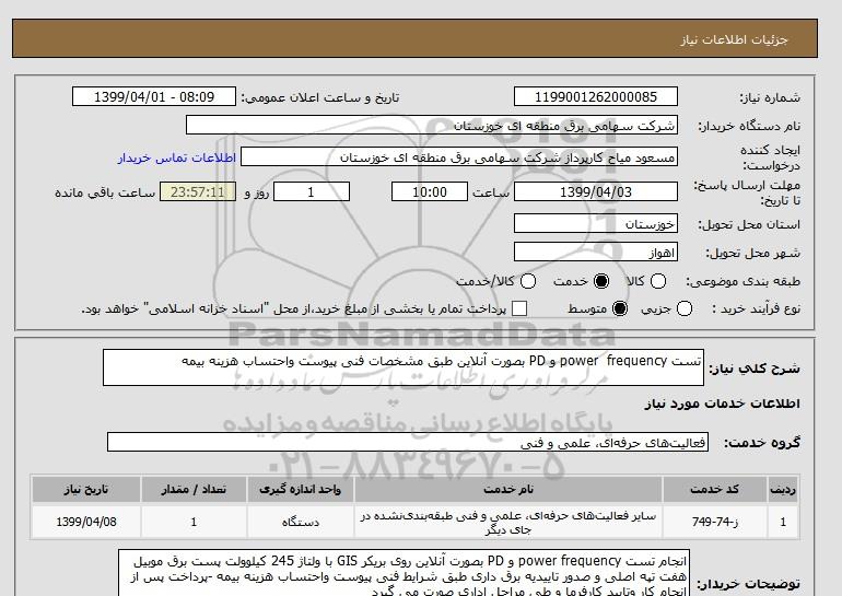 شرح کلی نیاز: تست power frequency و PD بصورت آنلاین طبق مشخصات فنی پیوست واحتساب هزینه بیمه