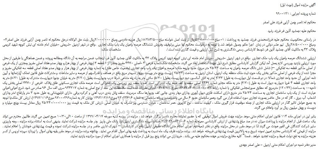 در راستای محکومیت محکوم علیه: فرزادمحمدی فرزند جمشید به پرداخت : 1- مبلغ570/000/000ریال از بابت اصل خواسته مبلغ18/283/500ریال هزینه دادرسی ومبلغ 2/000/000ریال بابت حق الوکاله درحق محکوم له ناصر چمن آرایی فرزند علی اصغر2- ومبلغ 28/500/000ریال نیم عشر دولتی در زمان اجرا حکم وصول خواهد شد. با توجه به درخواست محکوم لها مبنی برتوقیف وفروش ششدانگ عرصه واعیان یک باب ملک تجاری ،واقع در شهر اردبیل -شریعتی -خیابان امام خامنه ای نبش کوچه شهید کریمی پلاک 43 به مالکیت آقای جمشید آذین فر ،توسط کارشناس رسمی دادگستری به شرح ذیل ارزیابی و قیمت گذاری شده است./. مشخصات ملک: