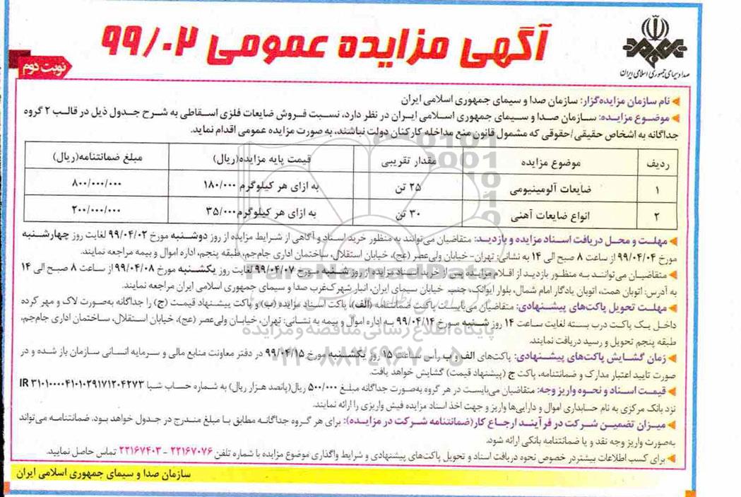 موضوع مزایده: سازمان صدا وسیمای جمهوری اسلامی ایران در نظر دارد نسبت به فروش ضایعات فلزی اسقاطی به شرح جدول ذیل در قالب 2 گروه جداگانه به اشخاص حقیقی / حقوقی که مشمول قانون منع مداخله کارکنان دولت نباشند به صورت مزایده عمومی اقدام نماید.
