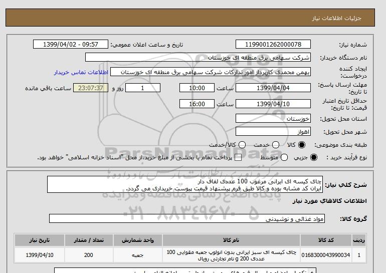 شرح کلی نیاز: چای کیسه ای ایرانی مرغوب 100 عددی لفاف دار