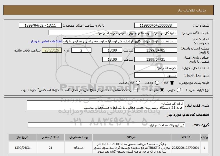 نام دستگاه خریدار:اداره کل نوسازی، توسعه و تجهیز مدارس خراسان رضوی