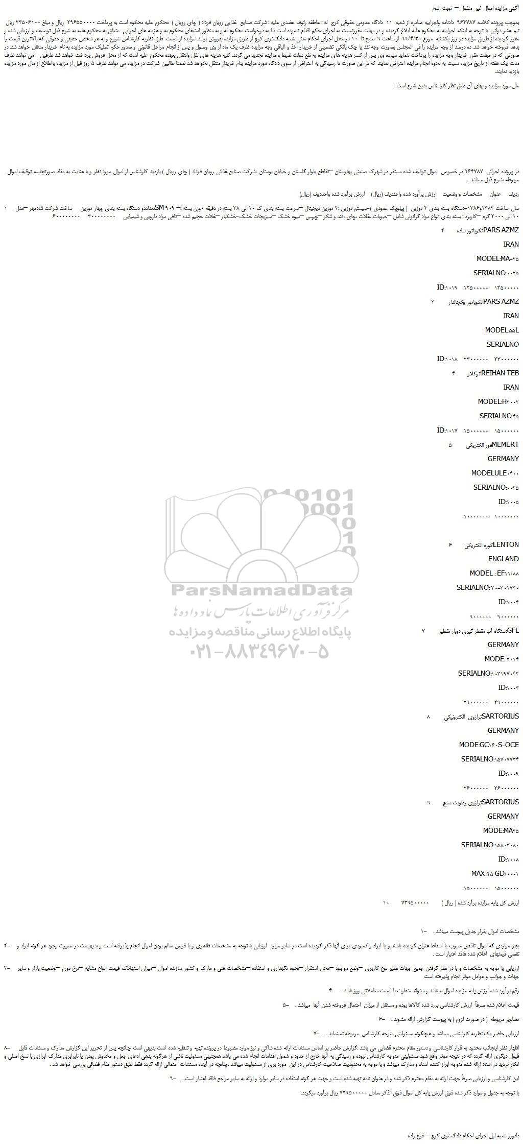2- بجز مواردی گه اموال ناقص معیوب یا اسقاط عنوان گردیده باشند و یا ایراد و کمبودی برای آنها ذکر گردیده است در سایر موارد ارزیابی با توجه به مشخصات ظاهری و با فرض سالم بودن اموال انجام پذیرفته است و بدیهیست در صورت وجود هر گونه ایراد و نقصی قیمتهای اعلام شده فاقد اعتبار است .
