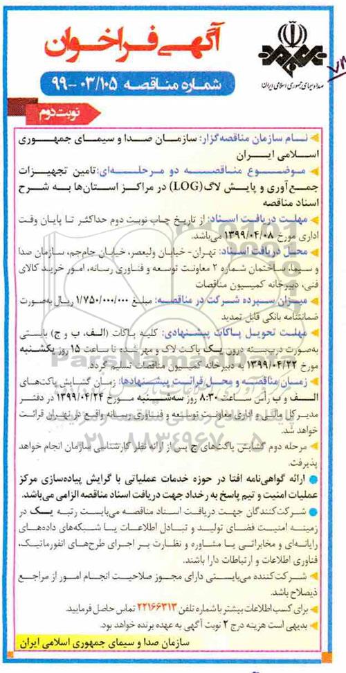 - موضوع مناقصه دو مرحله ای: تامین تجهیزات جمع آوری و پایش لاگ log در مراکز استان ها به شرح اسناد مناقصه