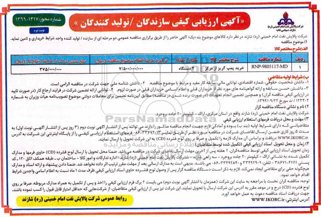 ارزیابی کیفی خرید پمپ گریز از مرکز - نوبت دوم, آگهی ارزیابی کیفی , ارزیابی کیفی خرید پمپ گریز از مرکز - نوبت دوم