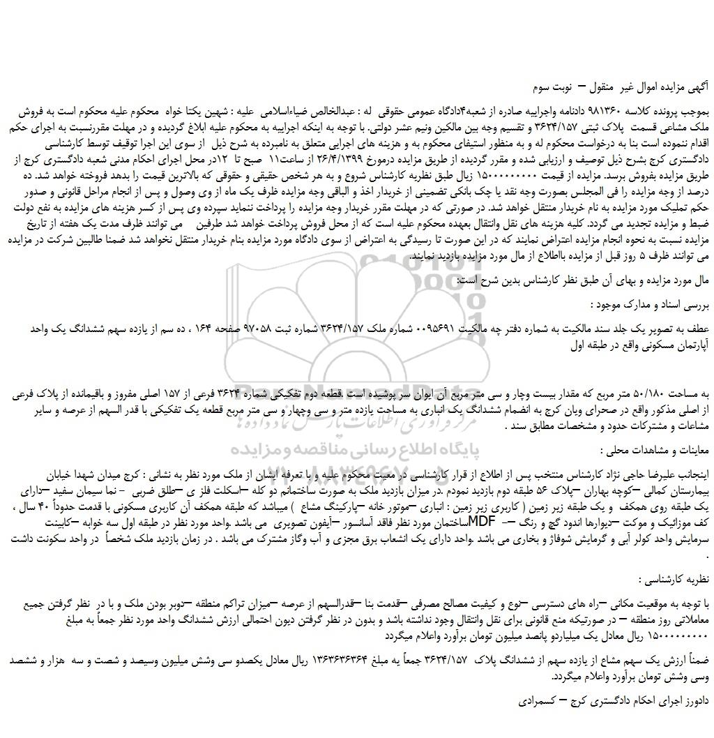 بموجب پرونده کلاسه 981360 دادنامه واجراییه صادره از شعبه4دادگاه عمومی حقوقی له : عبدالخالص ضیاءاسلامی علیه : شهین یکتا خواه محکوم علیه محکوم است به فروش ملک مشاعی قسمت پلاک ثبتی 3624/157 و تقسیم وجه بین مالکین ونیم عشر دولتی. با توجه به اینکه اجراییه به محکوم علیه ابلاغ گردیده و در مهلت مقررنسبت به اجرای حکم اقدام ننموده است بنا به درخواست محکوم له و به منظور استیفای محکوم به و هزینه های اجرایی متعلق به نامبرده به شرح ذیل از سوی این اجرا توقیف توسط کارشناسی دادگستری کرج بشرح ذیل توصیف و ارزیابی شده و مقرر گردیده از طریق مزایده درمورخ 26/4/1399 از ساعت11 صبح تا 12در محل اجرای احکام مدنی شعبه دادگستری کرج از طریق مزایده بفروش برسد. مزایده از قیمت 15000000000 زیال طبق نظریه کارشناس شروع و به هر شخص حقیقی و حقوقی که بالاترین قیمت را بدهد فروخته خواهد شد. ده درصد از وجه مزایده را فی المجلس بصورت وجه نقد یا چک بانکی تضمینی از خریدار اخذ و الباقی وجه مزایده ظرف یک ماه از وی وصول و پس از انجام مراحل قانونی و صدور حکم تملیک مورد مزایده به نام خریدار منتقل خواهد شد. در صورتی که در مهلت مقرر خریدار وجه مزایده را پرداخت ننماید سپرده وی پس از کسر هزینه های مزایده به نفع دولت ضبط و مزایده تجدید می گردد. کلیه هزینه های نقل وانتقال بعهده محکوم علیه است که از محل فروش پرداخت خواهد شد طرفین می توانند ظرف مدت یک هفته از تاریخ مزایده نسبت به نحوه انجام مزایده اعتراض نمایند که در این صورت تا رسیدگی به اعتراض از سوی دادگاه مورد مزایده بنام خریدار منتقل نخواهد شد ضمنا طالبین شرکت در مزایده می توانند ظرف 5 روز قبل از مزایده بااطلاع از مال مورد مزایده بازدید نمایند.
