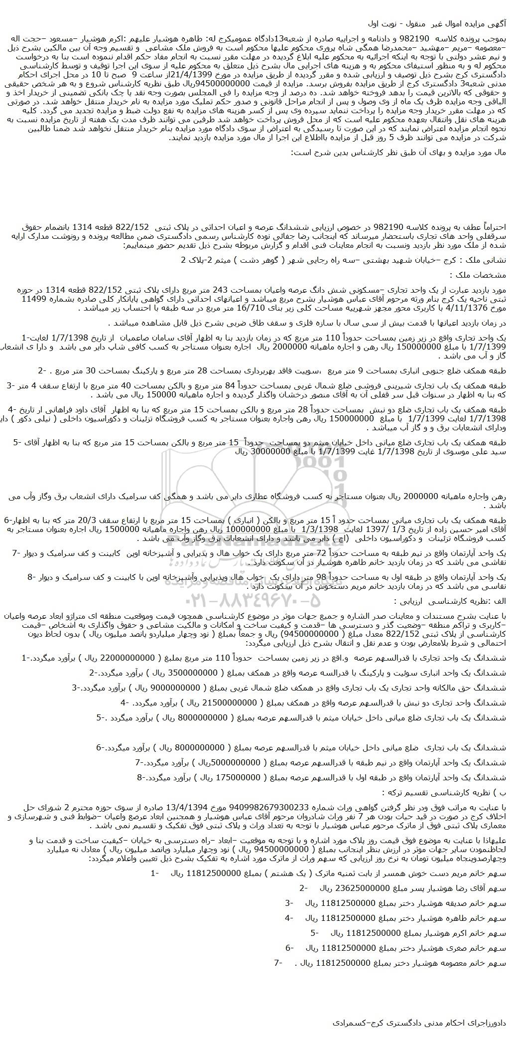 1-ششدانگ یک واحد تجاری با قدرالسهم عرصه و.اقع در زیر زمین بمساحت حدوداً 110 متر مربع بملبغ ( 22000000000 ریال ) برآورد میگردد.