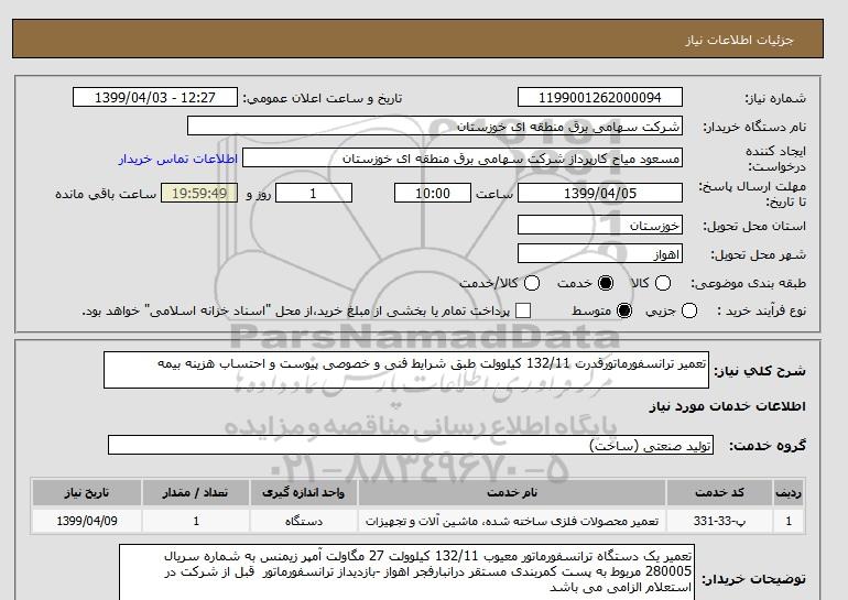 شرح کلی نیاز: تعمیر ترانسفورماتورقدرت 132/11 کیلوولت طبق شرایط فنی و خصوصی پیوست و احتساب هزینه بیمه