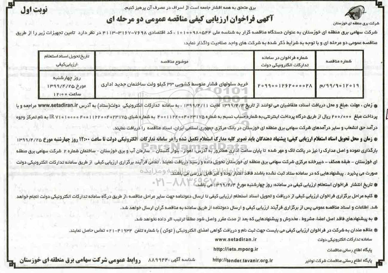 شرکت سهامی برق منطقه ای خوزستان به شناسه ملی 10100980544 کد اقتصادی 7698-3167-4113 در نظر دارد تامین تجهیزات زیر را از طریق مناقصه عمومی دو مرحله ای و با توجه به شرایط ذکر شده به شرکت های واجد صلاحیت واگذار نماید