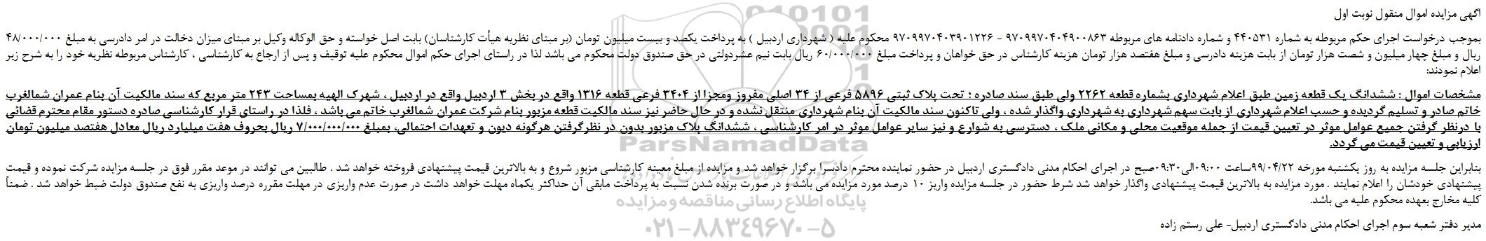 بموجب درخواست اجرای حکم مربوطه به شماره 440531 و شماره دادنامه های مربوطه 9709970404900863 - 9709970403901226 محکوم علیه ( شهرداری اردبیل ) به پرداخت یکصد و بیست میلیون تومان (بر مبنای نظریه هیأت کارشناسان) بابت اصل خواسته و حق الوکاله وکیل بر مبنای میزان دخالت در امر دادرسی به مبلغ 48/000/000 ریال و مبلغ چهار میلیون و شصت هزار تومان از بابت هزینه دادرسی و مبلغ هفتصد هزار تومان هزینه کارشناس در حق خواهان و پرداخت مبلغ 60/000/000 ریال بابت نیم عشردولتی در حق صندوق دولت محکوم می باشد لذا در راستای اجرای حکم اموال محکوم علیه توقیف و پس از ارجاع به کارشناسی ، کارشناس مربوطه نظریه خود را به شرح زیر اعلام نمودند: