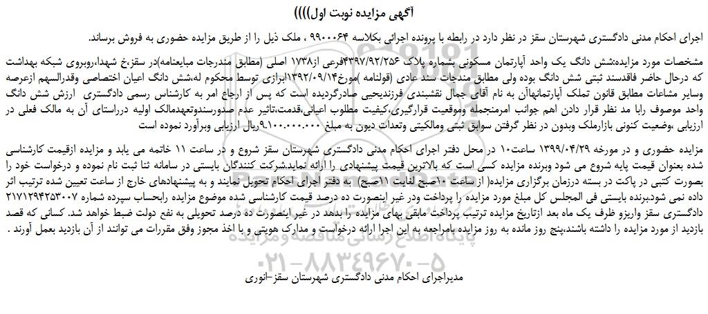 اجرای احکام مدنی دادگستری شهرستان سقز در نظر دارد در رابطه با پرونده اجرائی بکلاسه 9900064 ، ملک ذیل را از طریق مزایده حضوری به فروش برساند.