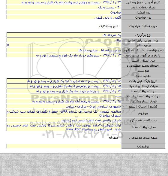 مناقصه عمومی یک مرحله ای شماره ۰۵/۹۹ حفظ و نگهداری فضای سبز شرکت و شهرک مهاجران