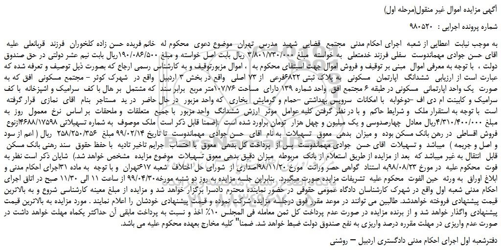 به موجب نیابت اعطایی از شعبه اجرای احکام مدنی مجتمع قضایی شهید مدرس تهران موضوع دعوی محکوم له خانم فریده حسن زاده کلخوران فرزند قربانعلی علیه اقای حسن جوادی مهماندوست سفلی فرزند خدمتعلی به خواسته مبلغ 3/801/730/000 ریال بابت اصل خواسته و مبلغ 190/086/500ریال بابت نیم عشر دولتی در حق صندوق دولت ، با توجه به معرفی اموال مبنی بر توقیف و فروش اموال جهت اسیتفای محکوم به ، اموال مزبورتوقیف و به کارشناس رسمی ارجاع که بصورت ذیل توصیف و تعرفه شده که عبارت است از ارزیابی ششدانگ اپارتمان مسکونی به پلاک ثبتی 6822فرعی از 73 اصلی واقع در بخش 3 اردبیل واقع در شهرک کوثر - مجتمع مسکونی افق که به صورت یک واحد اپارتمانی مسکونی در طبقه 6 مجتمع افق واحد شماره 139 دارای مساحت 107/76متر مربع برابر سند که مشتمل بر هال با کف سرامیک و اشپزخانه با کف سرامیک و کابینت ام دی اف -دوخوابه با امکانات سرویس بهداشتی -حمام و گرمایش بخاری که واحد مزبور در حال حاضر در ید مستاجر بنام اقای نمازی قرار گرفته است با توجه به استقرار ملک و شرایط حاکم و با در نظر گرفتن کلیه عوامل موثر ارزش ششدانگ واحد مزبور با جمیع متعلقات و ملحقات بر اساس نرخ معمول روز به مبلغ 4/310/400/000ریال معادل چهارصدوسی و یک میلیون و چهل هزار تومان براورد شده است .(ضمنا قابل ذکر است ملک موصوف به شماره تسهیلاتی 4688/17598ازنوع فروش اقساطی در رهن بانک مسکن بوده و میزان بدهی معوق تسهیلات به نام اقای حسن جوادی مهماندوست تا تاریخ 99/02/14 مبلغ 258/250/356 ریال ( اعم از سود و اصل و جریمه ) میباشد و تسهیلات اقای حسن جوادی مهماندوست پس از پرداخت کل بدهی معوق با احتساب جرایم تاخیر تادیه با حفظ حقوق سند رهنی بانک مسکن قابل انتقال به غیر میباشد که بعد از مزایده از طریق استعلام از بانک مربوطه میزان دقیق بدهی معوق تسهیلات موضوع مزایده مشخص خواهد شد.) شایان ذکر است نظر به فوت محکوم علیه در مورخ 98/08/23به استناد گواهی حصر وراثت مورخ 98/11/20اصداری از شورای حل اختلاف شعبه 617تهران و با توجه به ماده 31اجرای احکام مدنی و ابلاغ اوراق به ورثه حین الفوت محکوم علیه تشریفات مزایده صورت میگیرد. بنابراین جلسه مزایده به روز دو شنبه مورخه99/04/30 از ساعت 11 الی 11/30 صبح در اتاق اجرای احکام مدنی شعبه اول واقع در شهرک کارشناسان دادگاه عمومی حقوقی در حضور نماینده محترم دادسرا برگزار خواهد شد و مزایده از مبلغ معینه کارشناسی شروع و به بالاترین قیمت پیشنهادی فروخته خواهدشد. طالبین می توانند در موعد مقرر فوق درجلسه مزایده شرکت نموده و قیمت پیشنهادی خودشان را اعلام نمایند . مورد مزایده به بالاترین قیمت پیشنهادی واگذار خواهد شد و از برنده مزایده در صورت عدم پرداخت کل ثمن معامله فی المجلس 10% اخذ و نسبت به پرداخت مابقی آن حداکثر یکماه مهلت خواهد داشت در صورت عدم واریزی در مهلت مقرره درصد واریزی به نفع صندوق دولت ضبط خواهد شد. ضمنا" کلیه مخارج بعهده محکوم علیه می باشد.
