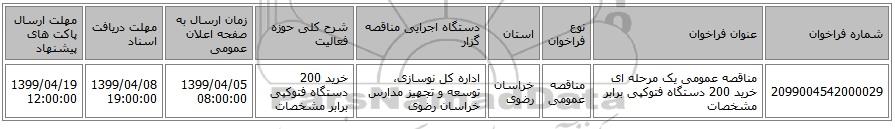 | 2099004542000029 | مناقصه عمومی یک مرحله ای خرید 200 دستگاه فتوکپی برابر مشخصات | مناقصه عمومی | خراسان رضوی | اداره کل نوسازی، توسعه و تجهیز مدارس خراسان رضوی | خرید 200 دستگاه فتوکپی برابر مشخصات | 1399/04/05 08:00:00 | 1399/04/08 19:00:00 | 1399/04/19 12:00:00 |