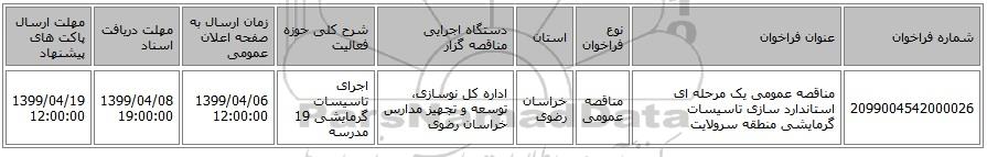 | 2099004542000026 | مناقصه عمومی یک مرحله ای استاندارد سازی تاسیسات گرمایشی منطقه سرولایت | مناقصه عمومی | خراسان رضوی | اداره کل نوسازی، توسعه و تجهیز مدارس خراسان رضوی | اجرای تاسیسات گرمایشی 19 مدرسه | 1399/04/06 12:00:00 | 1399/04/08 19:00:00 | 1399/04/19 12:00:00 |