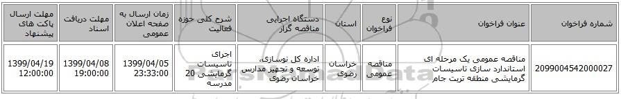 | 2099004542000027 | مناقصه عمومی یک مرحله ای استاندارد سازی تاسیسات گرمایشی منطقه تربت جام | مناقصه عمومی | خراسان رضوی | اداره کل نوسازی، توسعه و تجهیز مدارس خراسان رضوی | اجرای تاسیسات گرمایشی 20 مدرسه | 1399/04/05 23:33:00 | 1399/04/08 19:00:00 | 1399/04/19 12:00:00 |