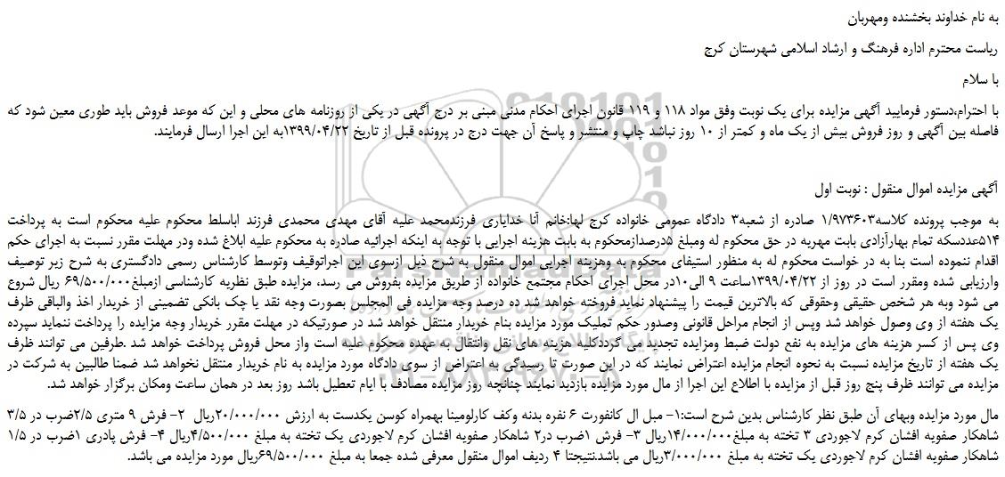 به موجب پرونده کلاسه1/973603 صادره از شعبه3 دادگاه عمومی خانواده کرج لها:خانم آنا خدایاری فرزندمحمد علیه آقای مهدی محمدی فرزند اباسلط محکوم علیه محکوم است به پرداخت 514عددسکه تمام بهارآزادی بابت مهریه در حق محکوم له ومبلغ 5درصدازمحکوم به بابت هزینه اجرایی با توجه به اینکه اجرائیه صادره به محکوم علیه ابلاغ شده ودر مهلت مقرر نسبت به اجرای حکم اقدام ننموده است بنا به در خواست محکوم له به منظور استیفای محکوم به وهزینه اجرایی اموال منقول به شرح ذیل ازسوی این اجراتوقیف وتوسط کارشناس رسمی دادگستری به شرح زیر توصیف وارزیابی شده ومقرر است در روز از 1399/04/22ساعت 9 الی10در محل اجرای احکام مجتمع خانواده از طریق مزایده بفروش می رسد، مزایده طبق نظریه کارشناسی ازمبلغ69/500/000 ریال شروع می شود وبه هر شخص حقیقی وحقوقی که بالاترین قیمت را پیشنهاد نماید فروخته خواهد شد ده درصد وجه مزایده فی المجلس بصورت وجه نقد یا چک بانکی تضمینی از خریدار اخذ والباقی ظرف یک هفته از وی وصول خواهد شد وپس از انجام مراحل قانونی وصدور حکم تملیک مورد مزایده بنام خریدار منتقل خواهد شد در صورتیکه در مهلت مقرر خریدار وجه مزایده را پرداخت ننماید سپرده وی پس از کسر هزینه های مزایده به نفع دولت ضبط ومزایده تجدید می گرددکلیه هزینه های نقل وانتقال به عهده محکوم علیه است واز محل فروش پرداخت خواهد شد .طرفین می توانند ظرف یک هفته از تاریخ مزایده نسبت به نحوه انجام مزایده اعتراض نمایند که در این صورت تا رسیدگی به اعتراض از سوی دادگاه مورد مزایده به نام خریدار منتقل نخواهد شد ضمنا طالبین به شرکت در مزایده می توانند ظرف پنج روز قبل از مزایده با اطلاع این اجرا از مال مورد مزایده بازدید نمایند چنانچه روز مزایده مصادف با ایام تعطیل باشد روز بعد در همان ساعت ومکان برگزار خواهد شد.