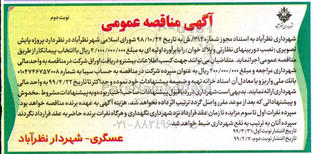 شهرداری نظرآباد به استناد مجوز شورای اسلامی شهر در نظر دارد پروژه پایش تصویری نصب دوربینهای نظارتی و پلاک خوان را با برآورد اولیه 4.000.000.000 ریال با انتخاب پیمانکار از طریق مناقصه عمومی اجرا نماید. متقاضیان می توانند جهت کسب اطلاعات بیشتر و دریافت اوراق شرکت در مناقصه به واحد مالی شهرداری مراجعه و مبلغ 200.000.000 ریال به عنوان سپرده شرکت در مناقصه به حساب سیبا به شماره 0104746757008 بانک ملی واریز و یا معادل آن اسناد خزانه تهیه و ضمیمه پیشنهادات خود نموده و حداکثر تا تاریخ 99.4.22به واحد مالی شهرداری ارائه نمایند. بدیهی است شهرداری در رد یا قبول پیشنهادات صاحب اختیار بوده و به پیشنهادات مشروط، مخدوش و پیشنهاداتی که بعد از موعد مقرر واصل گردد، ترتیب اثر داده نخواهد شد.