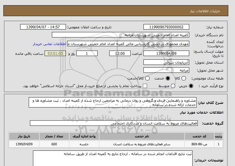 شرح کلی نیاز: مشاوره و راهنمایی فردی و گروهی و روان درمانی به مراجعین ارجاع شده از کمیته امداد ، ثبت مشاوره ها و خدمات ارائه شده در سامانه
