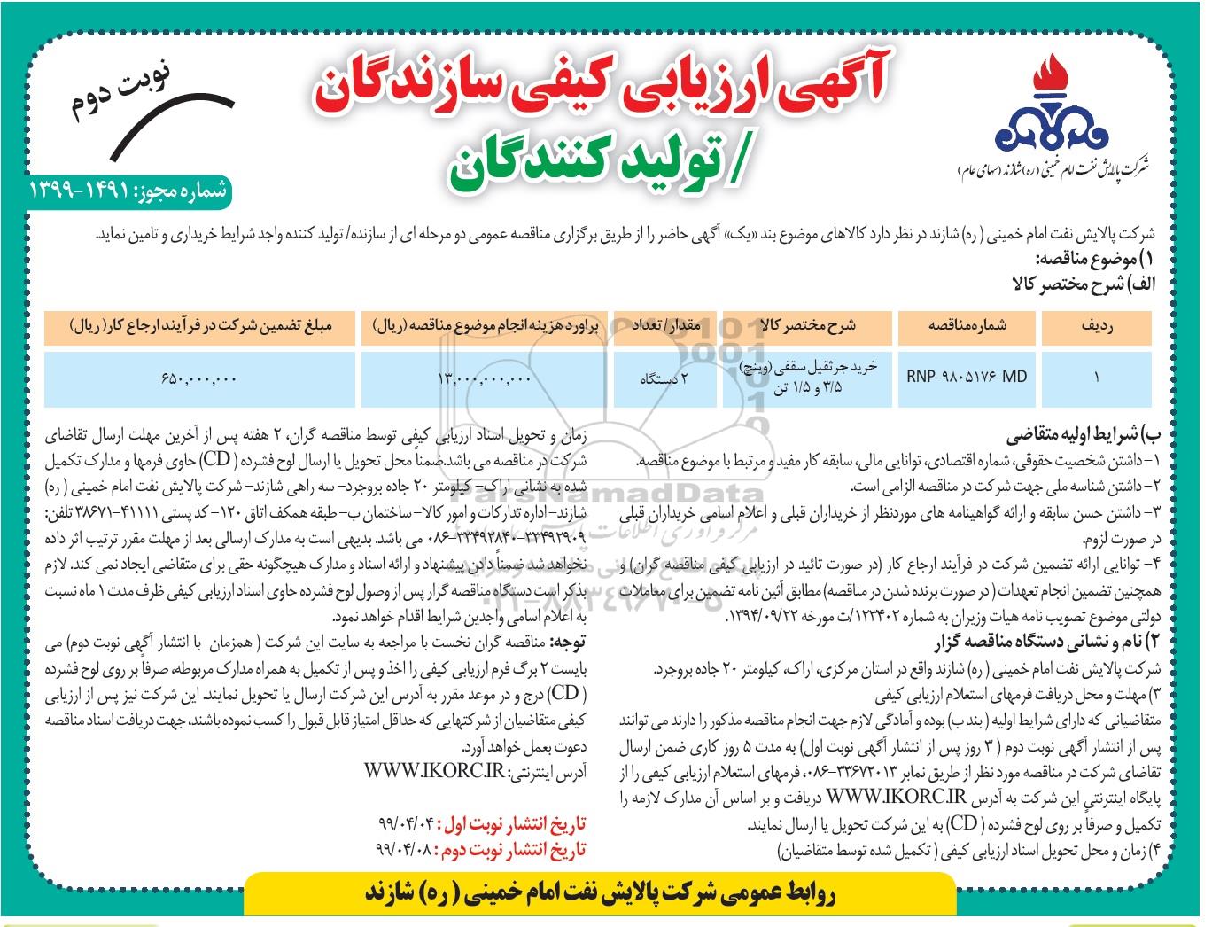 شرکت پالایش نفت امام خمینی (ره) شازند در نظر دارد کالاهای موضوع بند یک آگهی حاضر را از طریق برگزاری مناقصه عمومی دو مرحله ای از تولید کننده کالا واجد شرایط خریداری و تامین نماید.