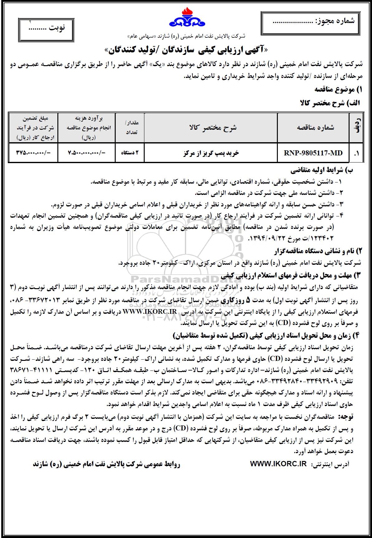 شرکت پالایش نفت امام خمینی (ره) شازند در نظر دارد کالاهای موضوع بند یک آگهی حاضر را از طریق برگزاری مناقصه عمومی دو مرحله ای از سازنده / تولید کننده واجد شرایط خریداری و تامین نماید.