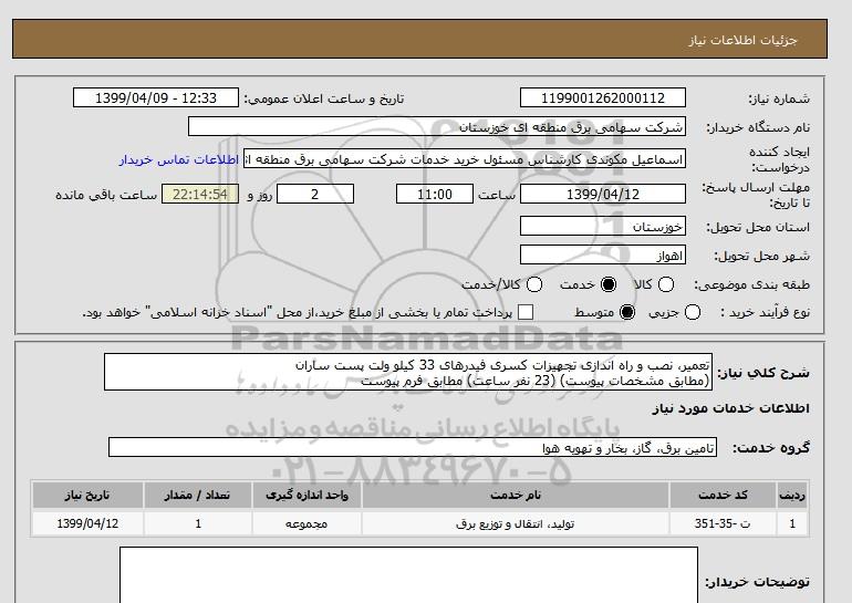استعلام بها و موضوع استعلام استعلام تعمیر، نصب و راه اندازی تجهیزات کسری فیدرهای 33 کیلو ولت پست ساران (مطابق مشخصات پیوست) (23 نفر ساعت) مطابق فرم پیوست به اطلاع کلیه شرکتها و افراد متخصص واجد شرایط میرساند، آگهی گذار در نظر دارد از طریق استعلام بها، نسبت به انتخاب و دریافت پیشنهادات اقدام نماید. این استعلام با کد آگهی ثبت شده در سامانه خبرگزاری پارس نماد : 2501052 منتشر شده است. مشخصات استعلام : تاریخ شروع استعلام: 1399/04/09 آخرین مهلت ارسال پیشنهاد قیمت : 1399/04/11 و محل اجرای پروژه : استان خوزستان میباشد. استعلام قیمت مورد درخواست : استعلام تعمیر، نصب و راه اندازی تجهیزات کسری فیدرهای 33 کیلو ولت پست ساران (مطابق مشخصات پیوست) (23 نفر ساعت) مطابق فرم پیوست با دستهبندیهای تخصصی و گروه های مرتبط : پست و انتقال نیرو, تجهیزات برق و الکترونیک, استعلام اطلاع رسانی میگردد.