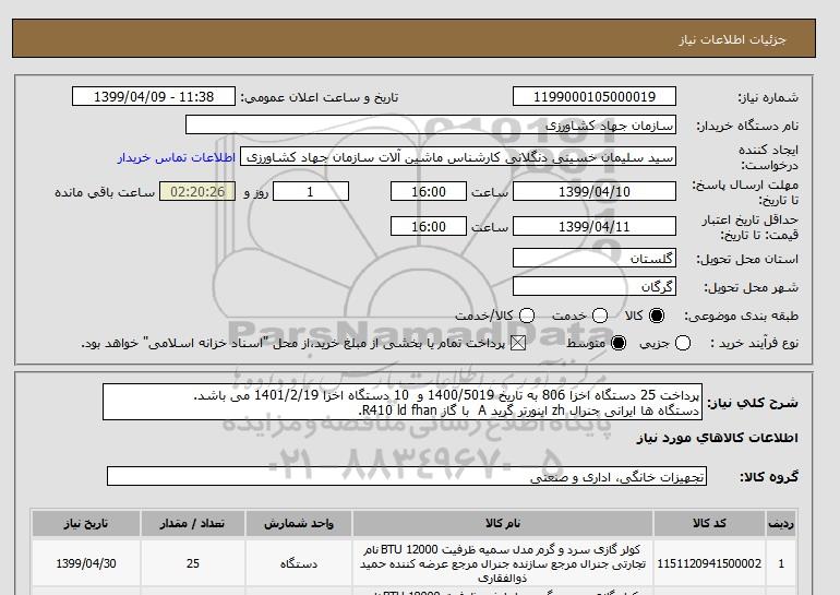 شرح کلی نیاز: پرداخت 25 دستگاه اخزا 806 به تاریخ 1400/5019 و 10 دستگاه اخزا 1401/2/19 می باشد.