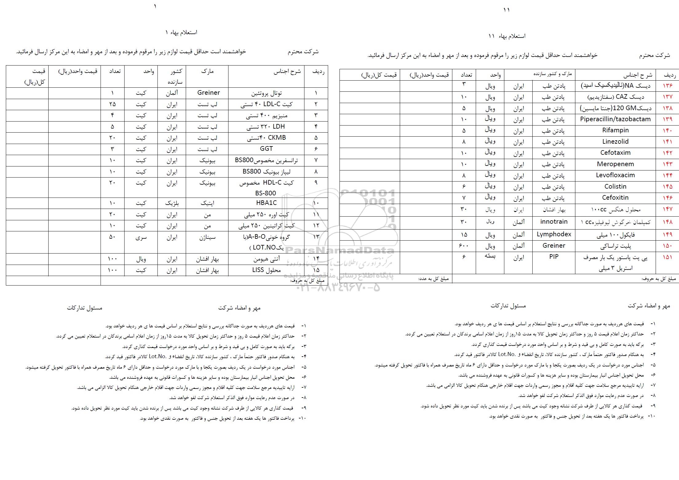 توتال پروتئین - کیت - منیزیک - ترانسفرین مخصوص - لیپاز بیوتیک - کیت اوره- کیت کراتینین - گروه خونی A.B.O با یک LOT-NO - آنتی هیومن- محلول LISS - دیسک NA - دیسک 120 GM-  محلول هنگس 100cc- فایکول - rifampin- linezolid- cefotaxim- meropenem- colostin-  کمپلمان خرگوش- فایکول - پلیت تراساکی - پی پت پاستور یک بار مصرف استریل 3 میلی