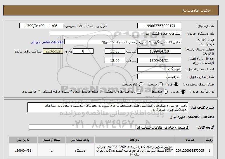 شرح کلی نیاز: تامین دوربین و میکروفن کنفرانس طبق مشخصات درج شده در دعوتنامه پیوست و تحویل در سازمان جهادکشاورزی هرمزگان