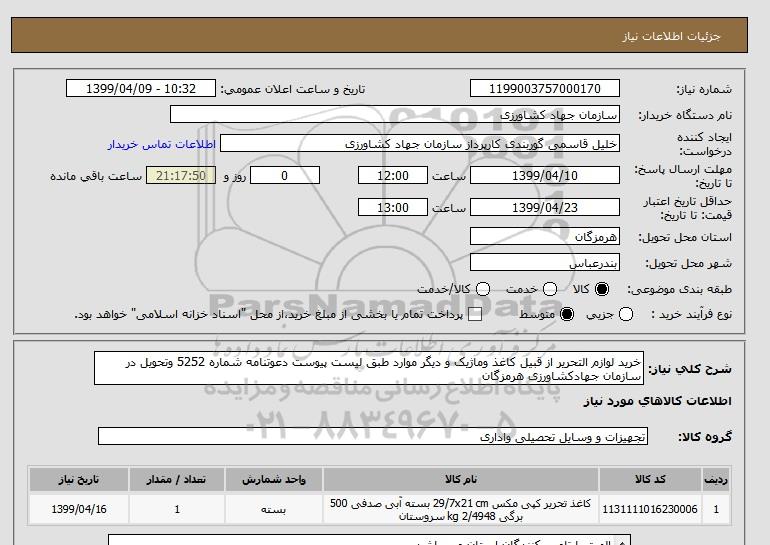 شرح کلی نیاز: خرید لوازم التحریر از قبیل کاغذ وماژیک و دیگر موارد طبق لیست پیوست دعوتنامه شماره 5252 وتحویل در سازمان جهادکشاورزی هرمزگان