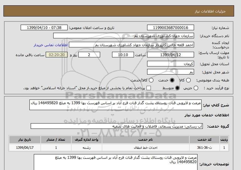 شرح کلی نیاز: مرمت و لایروبی قنات روستای پشت گدار قنات فرح آباد بر اساس فهرست بها 1399 به مبلغ 146495820 ریال